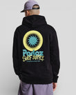 The Submerge Hoodie in Black. A loopback hoodie crafted from a premium organic cotton and recycled polyester blend. Designed with elasticated ribbed trims, a kangaroo pouch pocket, and an adjustable drawstring hood. Finished with printed branding on the chest and a large print on the back.